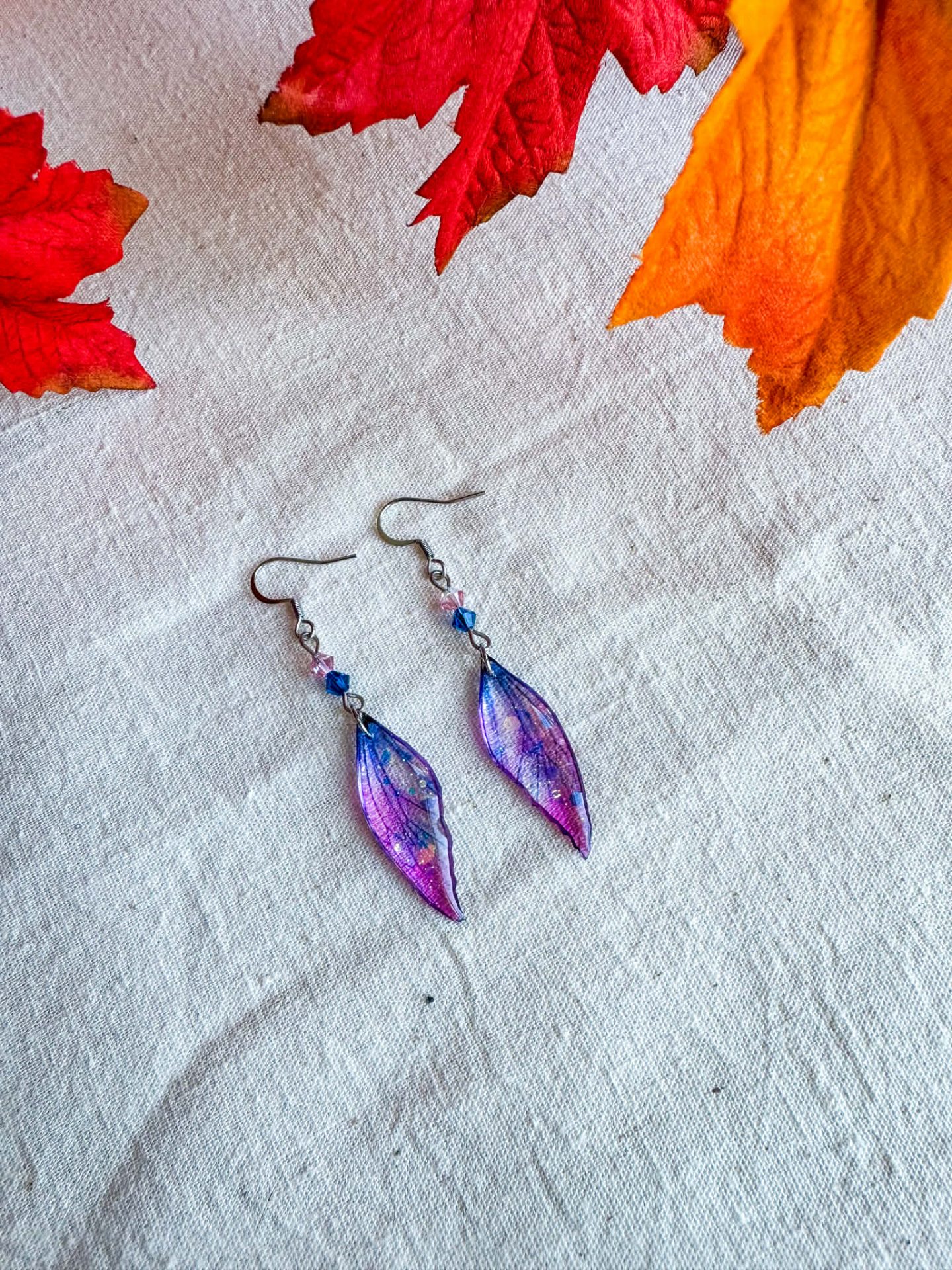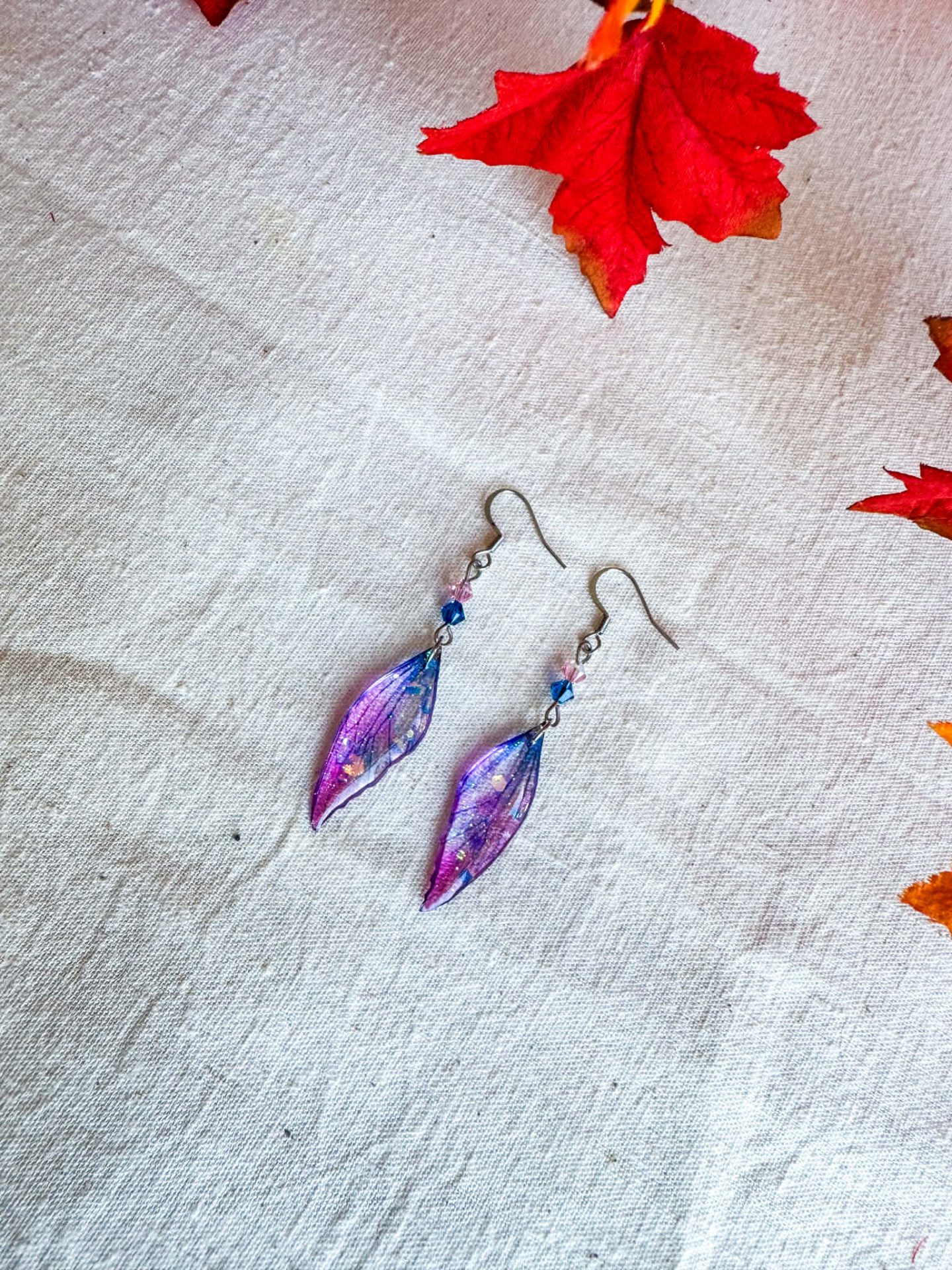 Cette paire de boucles d’oreilles est composée de 2 Ailes d’Elfe de couleur pourpre et violine, inspirées des colchiques d’automne.